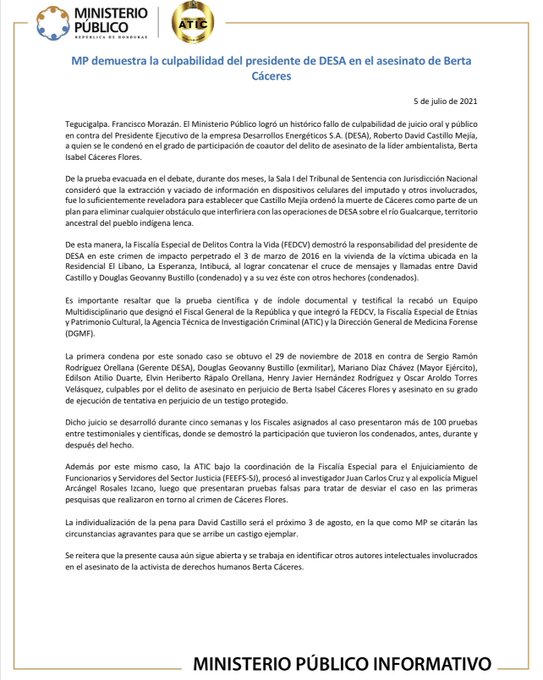 MP demuestra la culpabilidad del presidente de DESA en el asesinato de Berta Cáceres