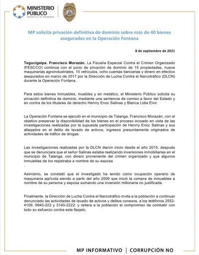 Tegucigalpa. Francisco Morazán. La Fiscalía Especial Contra el Crimen Organizado (FESCCO) continúa con el juicio de privación de dominio de 15 propiedades, nueve maquinarias agroindustriales, 10 vehículos, ocho cuentas bancarias y dinero en efectivo asegurados en marzo de 2017 por la Dirección de Lucha Contra el Narcotráfico (DLCN) durante la Operación Fontana.