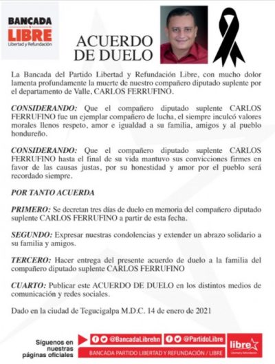 Enorme pesar en las filas del Partido Libertad y Refundación, en especial sus bases del departamento de Valle, al conocerse este día el sensible fallecimiento del diputado Carlos Ferrufino.