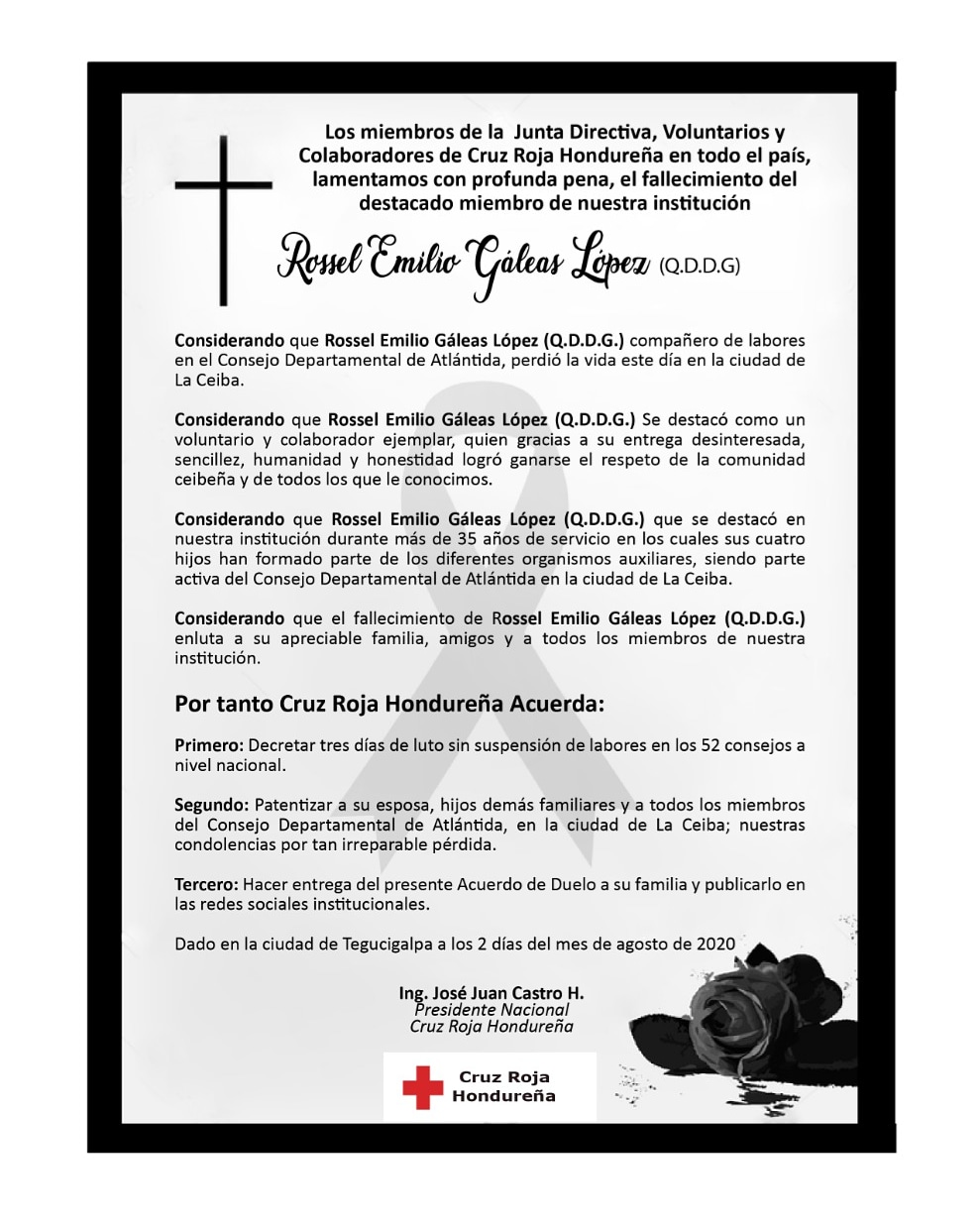 Los miembros de la Junta Directiva, Voluntarios y Colaboradores de Cruz Roja Hondureña, informaron y a la vez lamentaron con profunda pena, el fallecimiento del destacado miembro Rossel Emilio Gáleas López.
