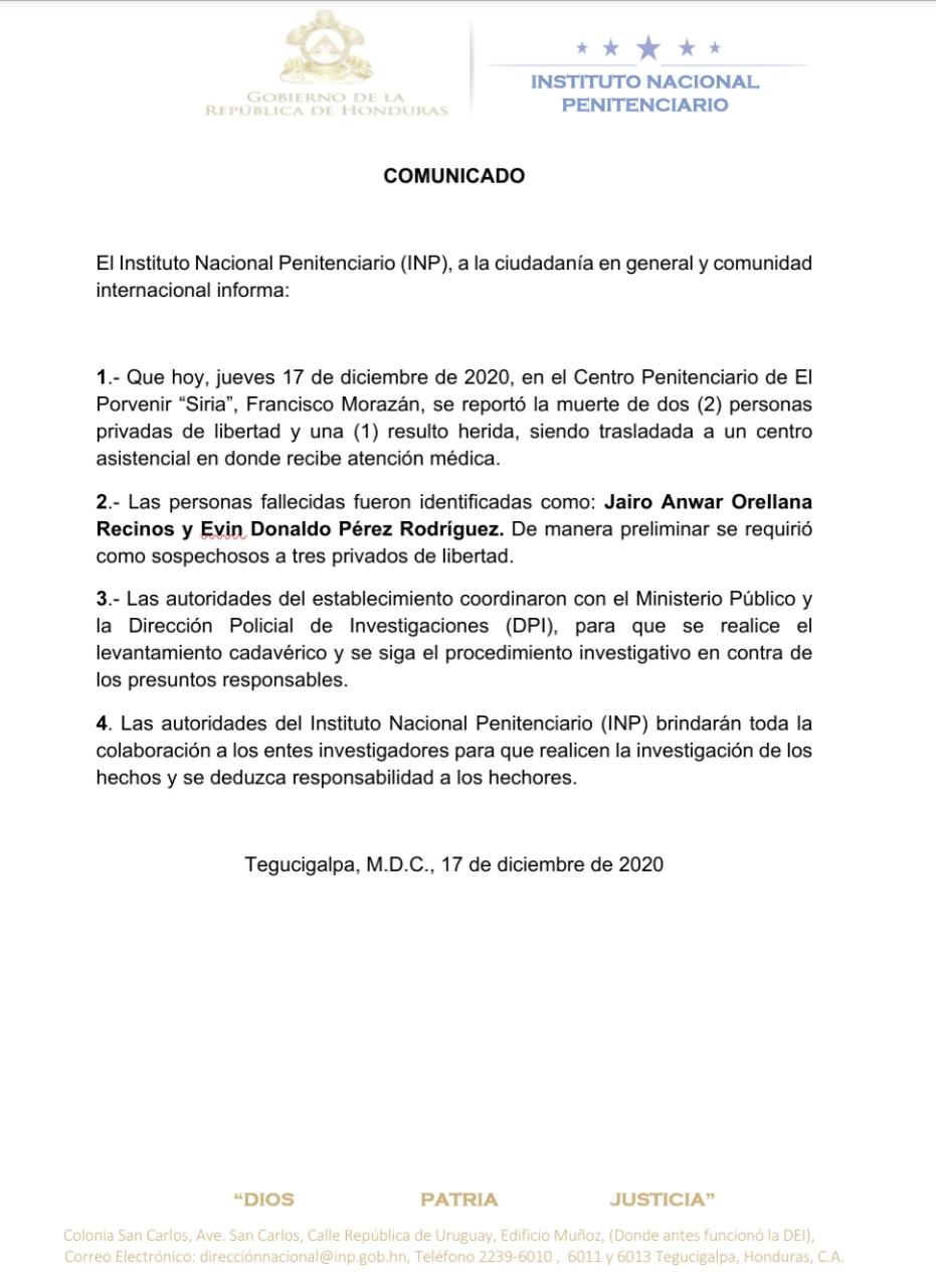 Las autoridades del Instituto Nacional Penitenciario (INP) informaron que brindarán toda la colaboración a los entes investigadores para que realicen la investigación de los hechos y se deduzca responsabilidad a los hechores.