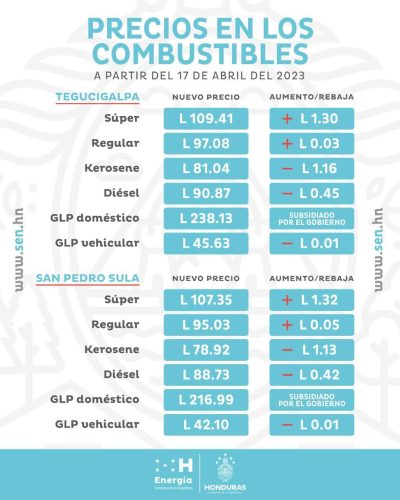 La gasolina súper sube 1.30 lempiras y ahora se cancelará en la bomba a 109.41 lempiras por galón, en tanto la gasolina regular varía tres centavos y ahora su nuevo valor será 97.08 lempiras por galón.