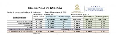 TEGUCIGALPA, HONDURAS. La Secretaría de Energía, a través de Dirección General de Hidrocarburos y Biocombustibles, oficializa la estructura de precios que estará vigente a partir del lunes 19 al domingo 25 de octubre de 2020.