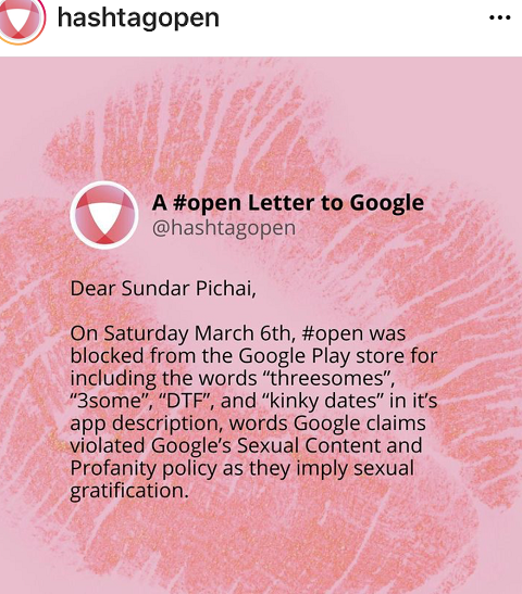 «Facebook, Instagram y otras grandes empresas de tecnología continúan suprimiendo el contenido, las ideologías y, a su vez, las comunidades, a través de vagas ‘políticas’ que parecen aplicarse convenientemente a las marcas y los pensamientos no convencionales», compartió #Open en su cuenta de Twitter después de ser suprimida de la tienda de aplicaciones de Google.