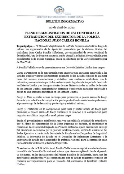La información fue confirmada por el oficial de Comunicaciones de la CSJ, Melvin Duarte, quien dijo que el documento que ratifica la extradición de Bonilla será firmado por cada uno de los 15 magistrados de ese poder del Estado.