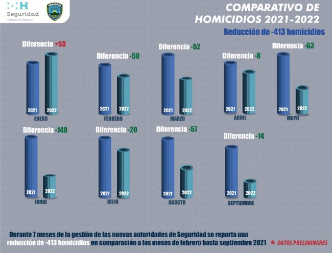 Según datos preliminares publicados por la Policía Nacional, mediante una imagen comparativa con cifras oficiales, con los casos de homicidios reportados en el 2021, hay una reducción de 413 homicidios de febrero a los días que han trascurrido de septiembre del 2022.