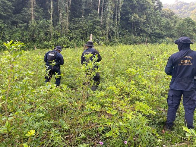 Los arbustos tienen diferentes alturas, la mayoría de ellos listos para su recolección y procesamiento para la elaboración de la pasta base para la fabricación de cocaína y otros derivados.