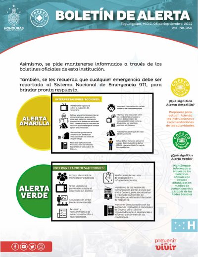 Mediante boletín informativo, las autoridades de la Comisión Permanente de Contingencias, informan a la población hondureña que por la continuidad de las lluvias en el territorio nacional, se extiende la alerta amarilla para 5 departamentos, y 8 departamentos continúan con alerta verde.