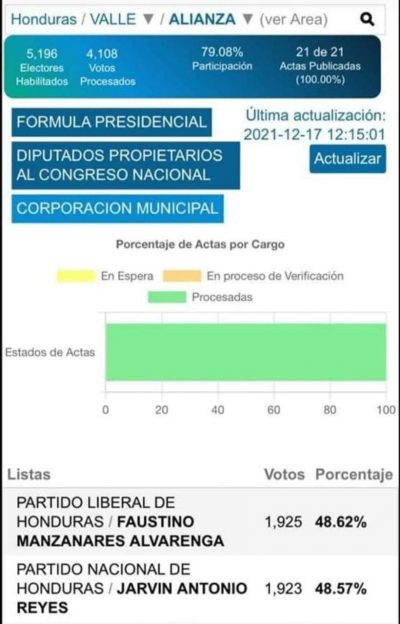 En una apretada votación de apenas dos votos de diferencia, el candidato del Partido Liberal de Honduras, Faustino Manzanares Alvarenga, ganó la alcaldía municipal de Alianza en el departamento de Valle.