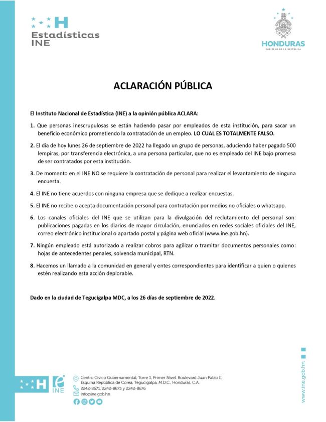 Mediante una aclaración publica, autoridades del INE, hacen de conocimiento público, que la información de plazas que circula en redes sociales, es FALSA, durante los últimos días, se ha hecho viral, que se está contratando personal en esta institución, pero se estaba solicitando a las personas el valor de L.500, para poder obtener una plaza.