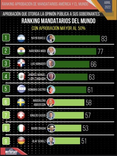El primer lugar se lo agencio al presidente de El Salvador, Nayib Bukele, que con el nuevo sondeo de opinión pública, ha subido dos puntos porcentuales con respecto a la última medición de la casa encuestadora realizada a principios de año, donde obtuvo el 81% de aprobación.