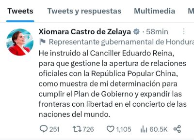 En un posteo en su cuenta oficial de Twitter, la presidenta Castro escribió “He instruido al Canciller Eduardo Reina, para que gestione la apertura de relaciones oficiales con la República Popular China, como muestra de mi determinación para cumplir el Plan de Gobierno y expandir las fronteras con libertad en el concierto de las naciones del mundo”.