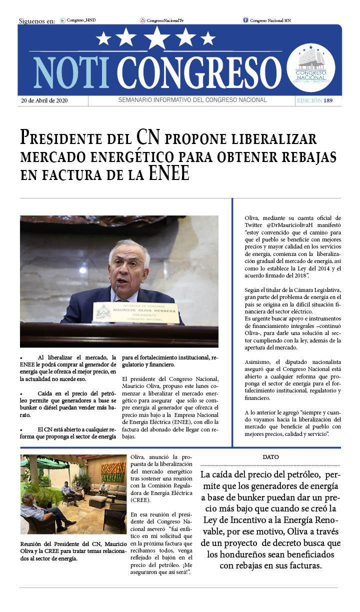 El presidente del Congreso Nacional, Mauricio Oliva, propuso este lunes comenzar a liberalizar el mercado energético para asegurar que sólo se compre energía al generador que ofrezca el precio más bajo a la Empresa Nacional de Energía Eléctrica (ENEE), con ello la factura del abonado debe llegar con rebajas.