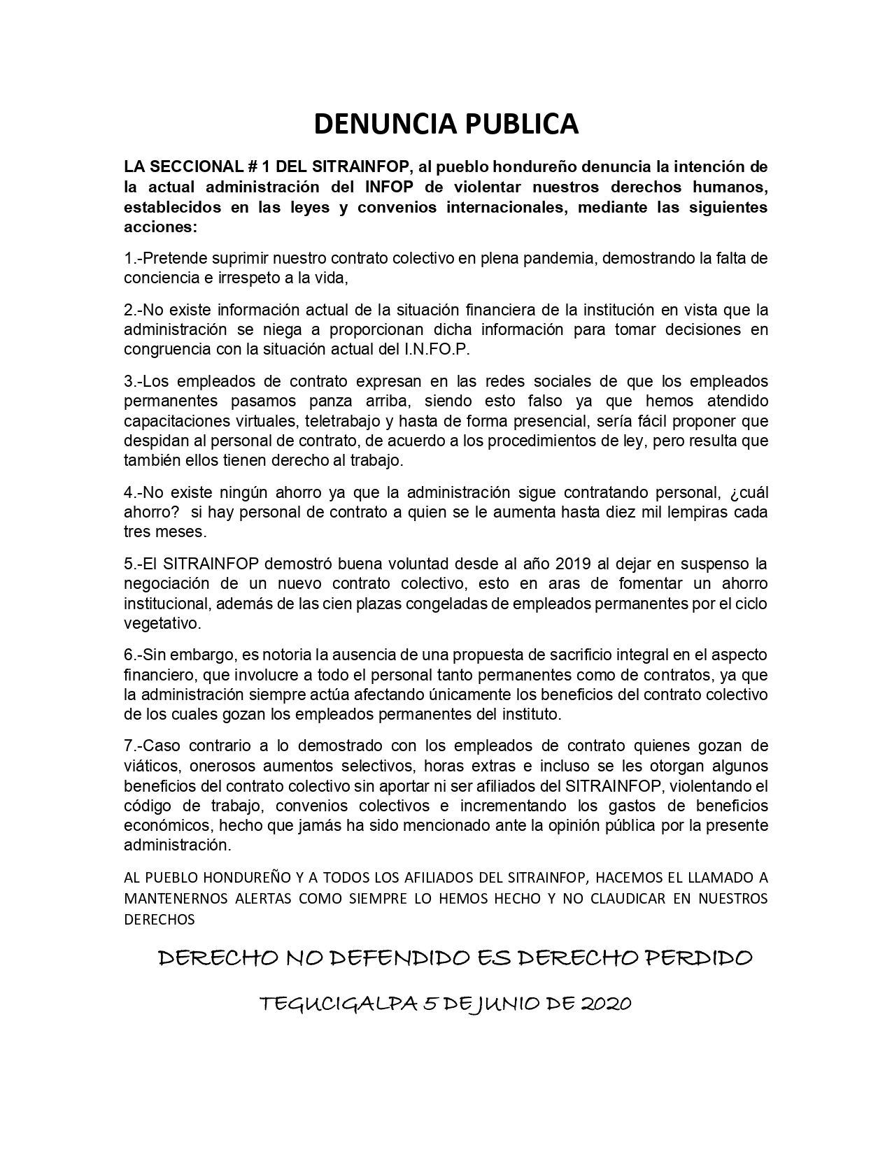 Los miembros del Sindicato de Trabajadores del Instituto Nacional de Formación Profesional (SITRAINFOP), protestaron este viernes porque les quieren suprimir el contrato colectivo.
