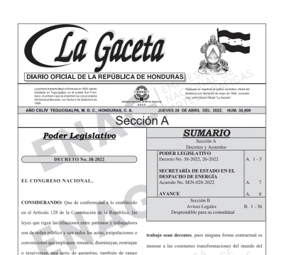 La última publicación del Diario Oficial La Gaceta presenta en su impresión el decreto legislativo que deroga la ley de Empleo por Hora.