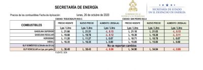 Tegucigalpa MDC. La Secretaría de Energía, a través de Dirección General de Hidrocarburos y Biocombustibles, oficializó la estructura de precios que estará vigente a partir del lunes 26 de octubre al domingo 01 de noviembre de 2020.