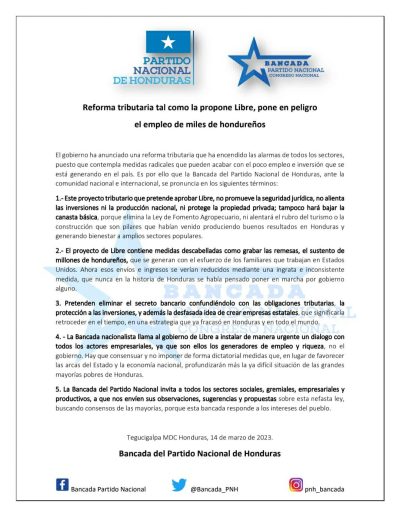 Los empleos de miles de personas se encuentran en peligro a causa de la reforma tributaria que promueve el Partido Libertad y Refundación (Libre), advirtió hoy la bancada del Partido Nacional.