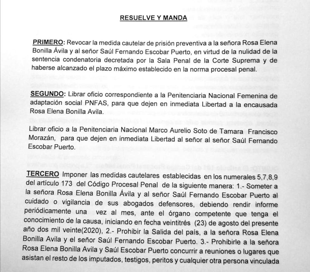Por unanimidad de votos el Tribunal de Sentencia en Materia de Corrupción, ha decidido revocar la medida cautelar de la Prisión Preventiva a la ex primera dama Rosa Elena de Lobo y su secretario Saúl Escobar, en virtud de haberse alcanzado el plazo máximo establecido en la norma procesal penal.