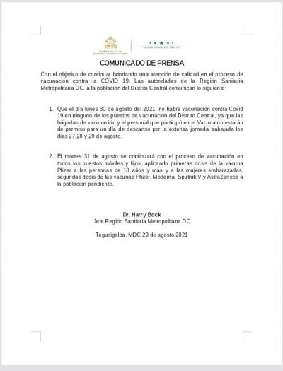 Tegucigalpa, Honduras. La Región Metropolitana de Salud en el Distrito Central, informó este domingo la suspensión para mañana lunes de la vacunación contra la Covid-19 en los diferentes puntos de inoculación.