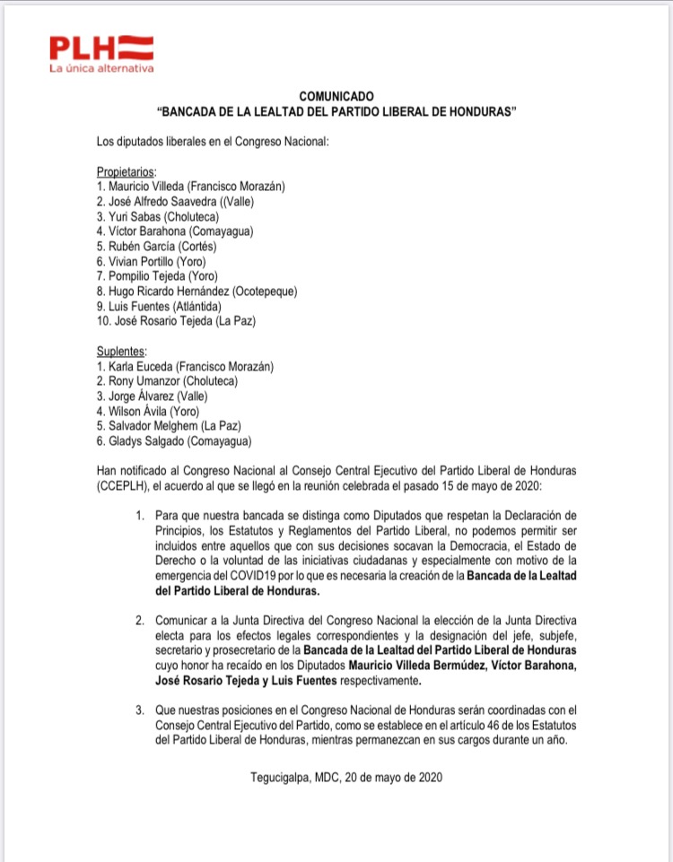 Esta facción política liberal comunicó a la Junta Directiva del Congreso Nacional y al Central Ejecutivo del Partido Liberal, que en una reunión celebrada el 15 de mayo, decidieron conformar esta bancada.
