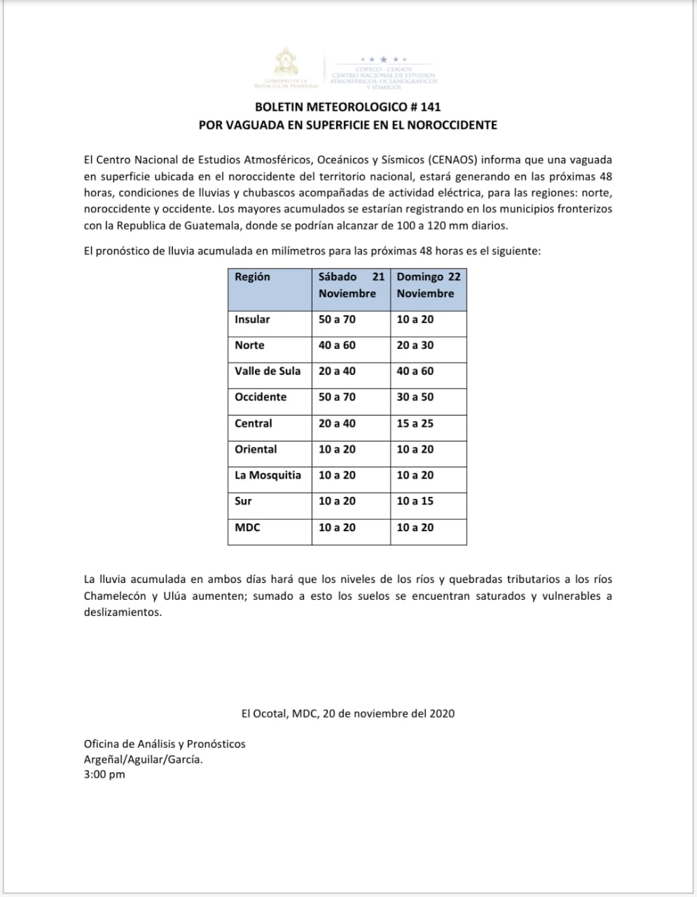 El Centro Nacional de Estudios Atmosféricos, Oceánicos y Sísmicos (CENAOS) informó que una vaguada en superficie ubicada en el noroccidente del territorio nacional, estará generando en las próximas 48 horas, condiciones de lluvias y chubascos acompañadas de actividad eléctrica, para las regiones: norte, noroccidente y occidente de Honduras.