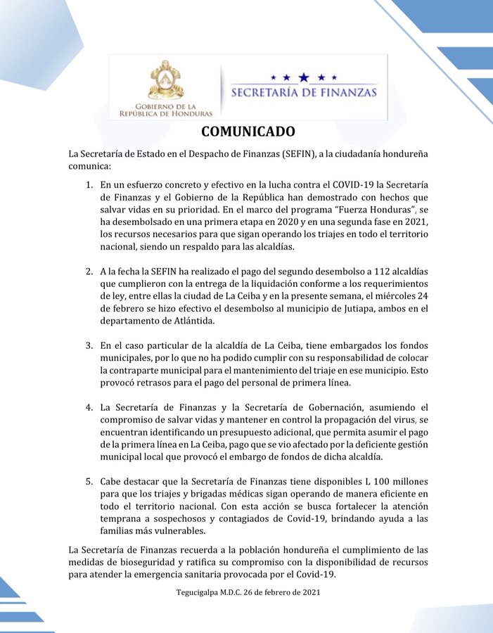 A través de un comunicado, la Secretaria de Finanzas (SEFIN) dio a conocer a la población en general que ha realizado el segundo desembolso para 112 alcaldías, con el fin de fortalecer los distintos triajes para seguir en luchar contra la pandemia del covid-19.