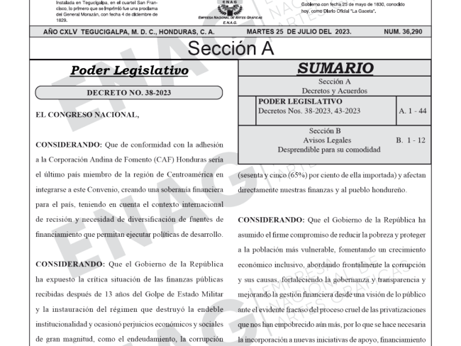 La publicación en La Gaceta reza: «Aprobar en toda y cada una de sus partes el ‘Convenio Sobre Inmunidades, Exenciones Y Privilegios Entre La República De Honduras Y La Corporación Andina De Fomento'».