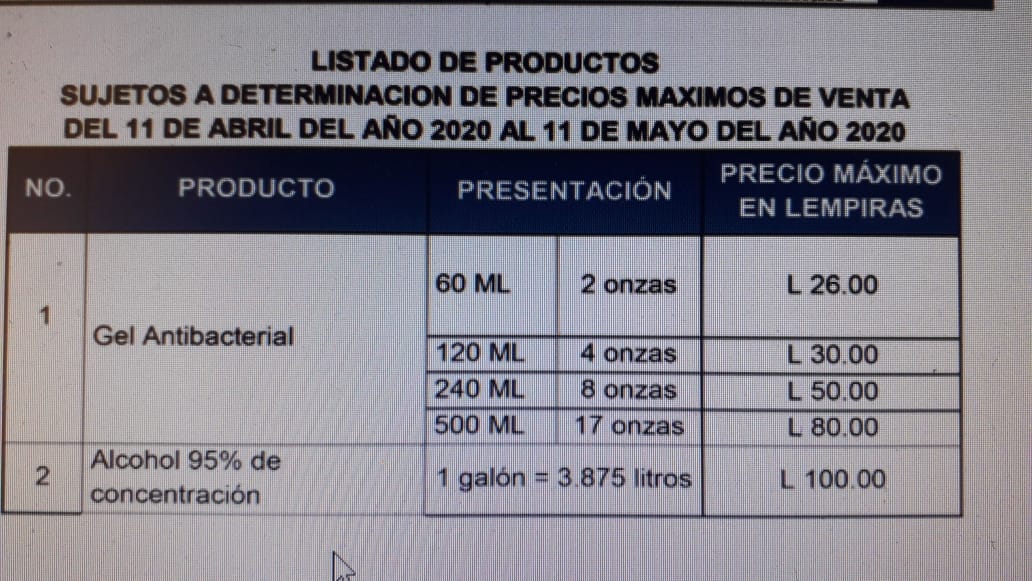 COPECO informa que según acuerdo ministerial número 018-2020 publicado en el Diario Oficial La Gaceta el jueves 12 de marzo del 2020, la Secretaría de Desarrollo Económico en conjunto con la Asociación de Fabricantes de Productos Farmacéuticos de Honduras (ANAPROHFAR), acordó la estabilidad de precios de este importante insumo para atender la emergencia sanitaria.