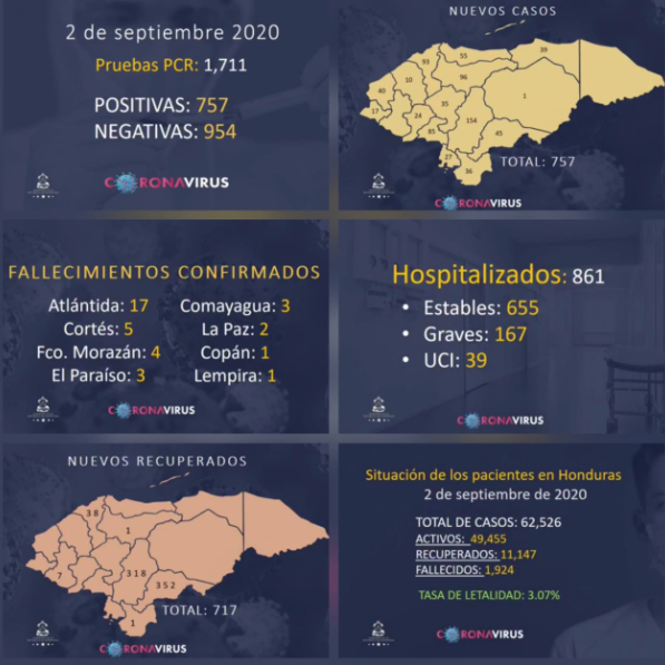 El Sistema Nacional de Gestión de Riesgos (SINAGER), informó mediante Cadena Nacional que el número de infectados por Covid-19 en Honduras es de 62, 526. Esto, ya que hubo 757 nuevos casos de coronavirus en este día.
