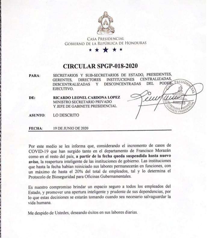 A partir de hoy viernes 19 de junio del 2020 la reapertura inteligente de las instituciones del Gobierno queda completamente suspendida. Esto se debe al incremento de casos de COVID-19 que han surgido tanto en el departamento de Francisco Morazán como en el resto del país.
