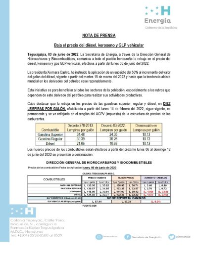 Mientras que, el queroseno registrará una rebaja de 1.99 lempiras y el diésel una reducción de 1.67 lempiras.