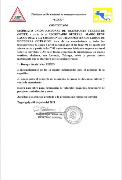 Por su parte, el dirigente del transporte de carga pesada, Santos Pavón, confirmó que la paralización se realiza en varias ciudades como Siguatepeque, Puerto Cortés y Tela.
