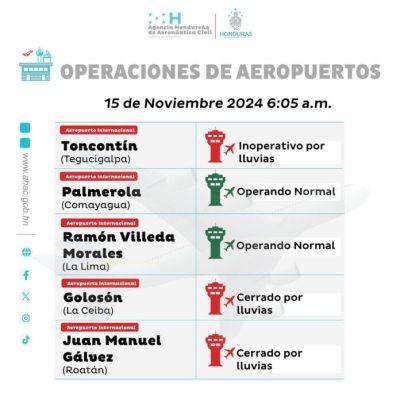La Agencia Hondureña de Aeronáutica Civil informó que este viernes permanecen sin operar los aeropuertos de Tegucigalpa, La Ceiba y Roatán a causa de las lluvias.