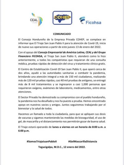 Tegucigalpa, Honduras. El presidente del Consejo Hondureño de la Empresa Privada (Cohep), Juan Sikaffy, informó que a partir de mañana jueves 13 de enero se realizará la reapertura del triaje del Bulevar Juan Pablo II.
