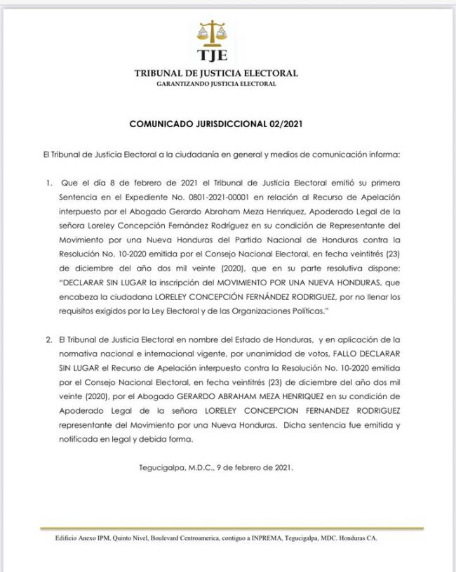 El Tribunal de Justicia Electoral emitió su primera Sentencia en el Expediente No. 0801-2021-00001 en relación al Recurso de Apelación interpuesto por el Abogado Gerardo Abraham Meza Henríquez, Apoderado Legal de la señora Loreley Concepción Fernández Rodríguez en su condición de Representante del Movimiento por una Nueva Honduras del Partido Nacional de Honduras contra la Resolución No. 10-2020 emitida por el Consejo Nacional Electoral, en fecha veintitrés (23) de diciembre del año dos mil veinte (2020), que en su parte resolutiva dispone: “DECLARAR SIN LUGAR la inscripción del MOVIMIENTO POR UNA NUEVA HONDURAS, que encabeza la ciudadana LORELEY CONCEPCIÓN FERNÁNDEZ RODRIGUEZ, por no llenar los requisitos exigidos por la Ley Electoral y de las Organizaciones Políticas.