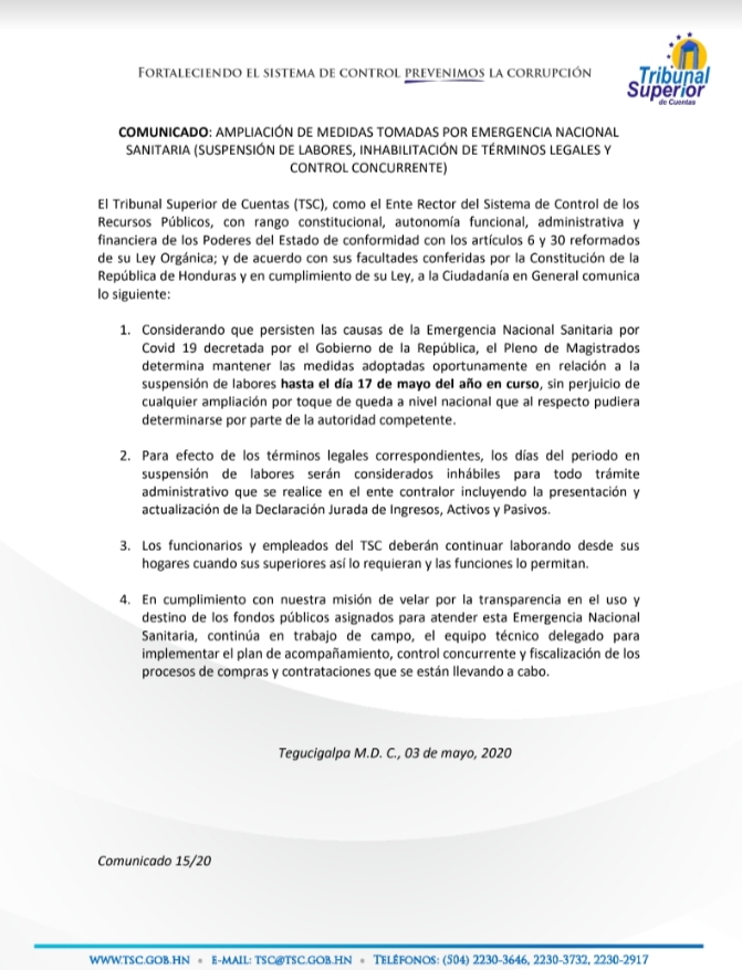 Los magistrados del Tribunal Superior de Cuentas (TSC), ordenaron este lunes la ampliación de la suspensión de labores en ese ente hasta el 17 de mayo.