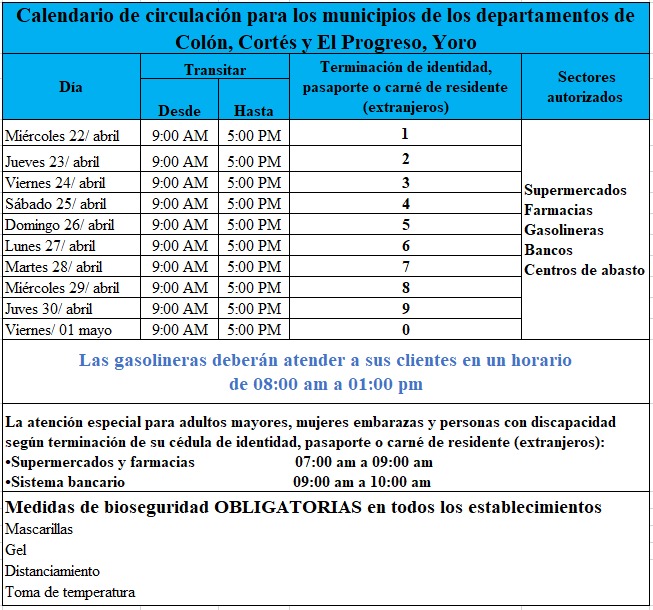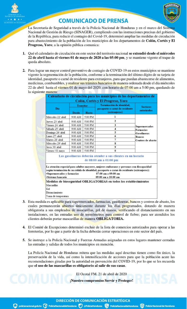 La Secretaría de Seguridad a través de la Policía Nacional de Honduras y en el marco del Sistema Nacional de Gestión de Riesgo (SINAGER), cumpliendo con las instrucciones precisas del gobierno de la República, para reducir el contagio del Covid-19, determinó ampliar las medidas de circulación para abastecimiento de la población de los municipios de los departamentos de Colón, Cortés y El Progreso, Yoro; a la opinión pública comunica: