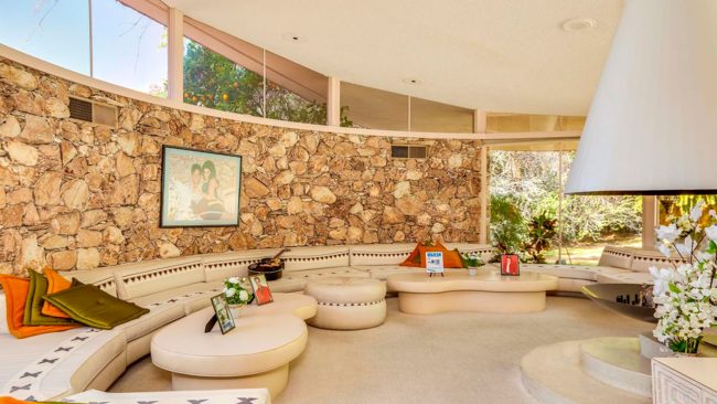 La vivienda de 1.431 metros cuadrados cuenta con paredes de roca, una chimenea flotante y pisos de terrazo y como cualquier buena casa en el desierto, hay una gran pileta en el patio trasero con vista a las montañas. Fue diseñada por el arquitecto modernista William Krisel, conocido por su talento innovador.