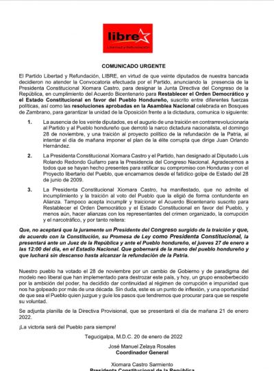 La mandataria electa por la voluntad popular los llamó «traidores»  anoche tras concluir la reunión con los  30 diputados que sí se reunieron con ella y apoyaron el acuerdo Bicentenario entre Libertad y Refundación (Libre) y el Partido Salvador de Honduras (PSH), que impulsa la candidatura de Luis Redondo.