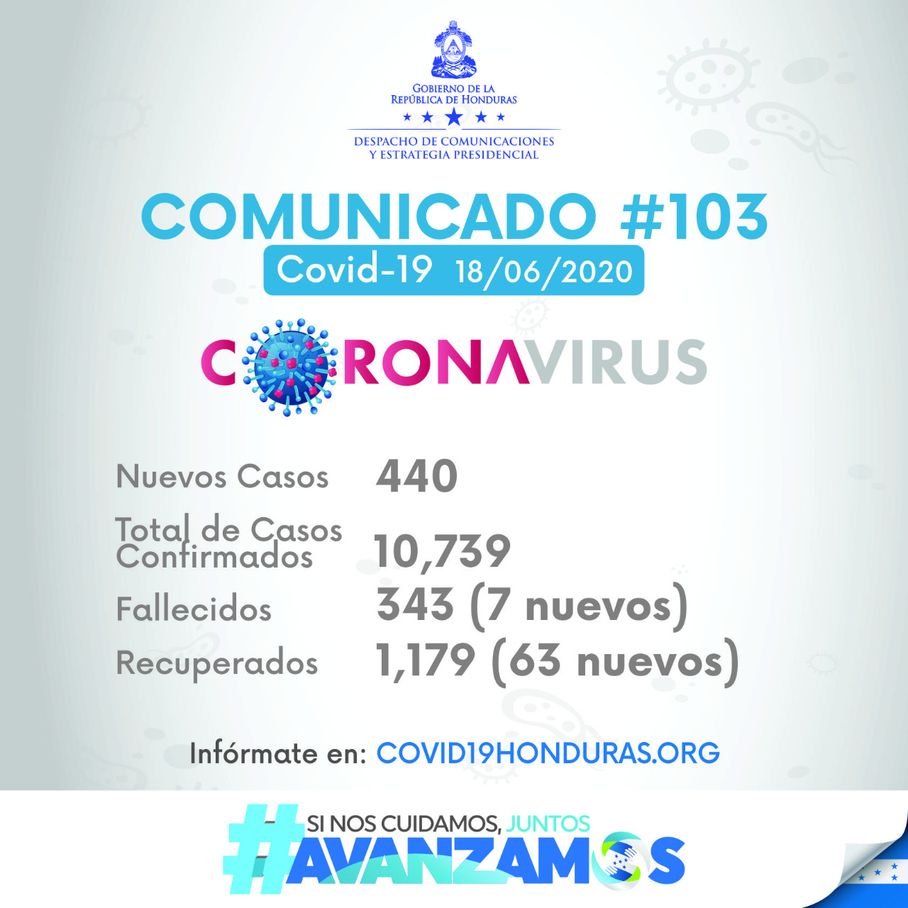 El Sistema Nacional de Gestión de Riesgos (SINAGER), informó mediante Cadena Nacional que el número de infectados por Covid-19 en Honduras es de 10,739. Esto, ya que hubo 440 nuevos casos de este virus en este día.