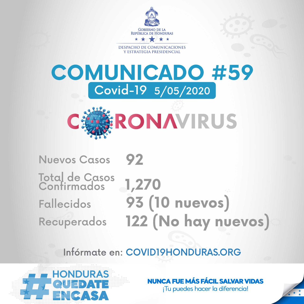 El Sistema Nacional de Riesgo, (Sinager), informó mediante Cadena Nacional que el número de infectados por Covid-19 en Honduras es de 1270 . Esto, ya que hubo 92 nuevos casos este día.