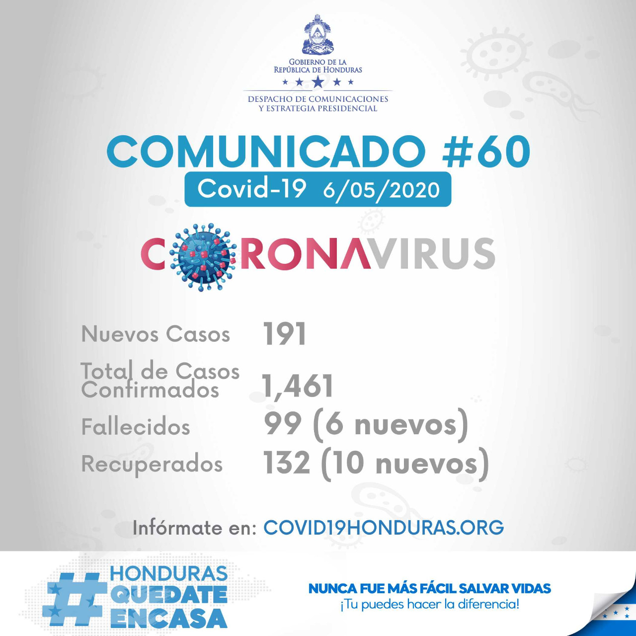 El Sistema Nacional de Riesgo, (Sinager), informó mediante Cadena Nacional que el número de infectados por Covid-19 en Honduras es de 1461. Esto, ya que hubo 191 nuevos casos este día.